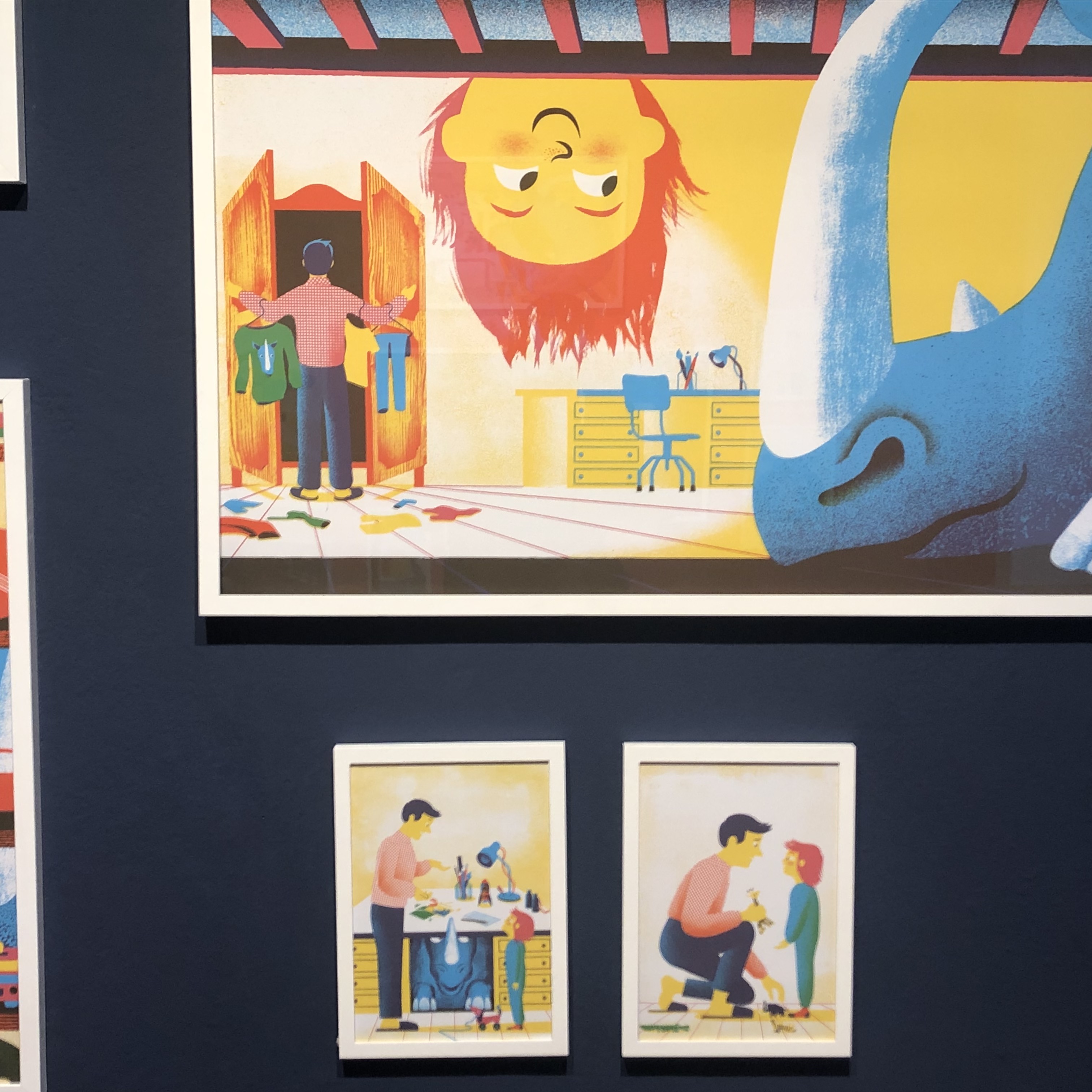 In der Galerie des Kreuzberger Kinderbuchladens Krumulus steht immer mindestens ein Buch im Mittelpunkt. In der neuen Ausstellung ist es ein Nashorn – ach was, eine ganze Horde! – Oder doch nicht? Kurioserweise mag es wohl Leute geben, für die das nicht ersichtlich ist. – Kein Wunder? Sind es lediglich Gedanken? Oder gar Fragen, die an der Wand hängen?
