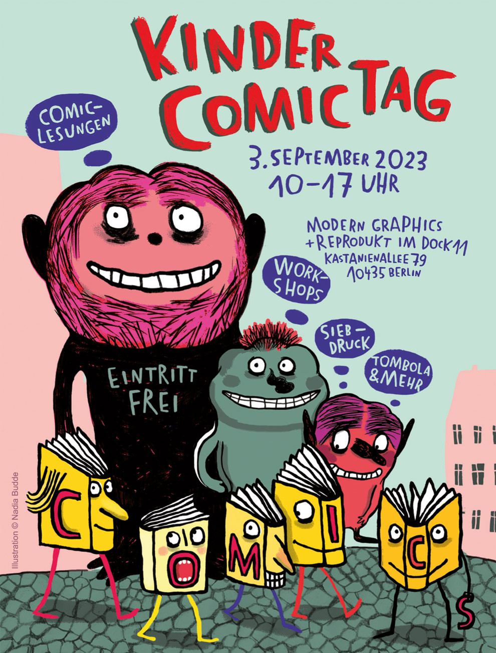 Am kommenden Sonntag, 3.9.2023, findet von 10-17 Uhr im Modern Graphics und im Dock 11 der bewährte, geliebte und turbulente Kinder Comic Tag statt. Es gibt Lesungen u.a. mit Mawil (Kindercomics), Josephine Mark (Trip mit Tropf), Mathias Wieland (Ariol), Lisa Weniger und Lukas Jantzen (Margo Maloo). Außerdem viele Workshops und Aktionen rund um Comics, Kinder und bunte Farben. Dazu eine Tombola und viel Musik. Das hört sich nach so einem tollen Tag an, da ist man schon fast nicht mehr traurig, dass die Sommerferien so schwupps vorbei sind.