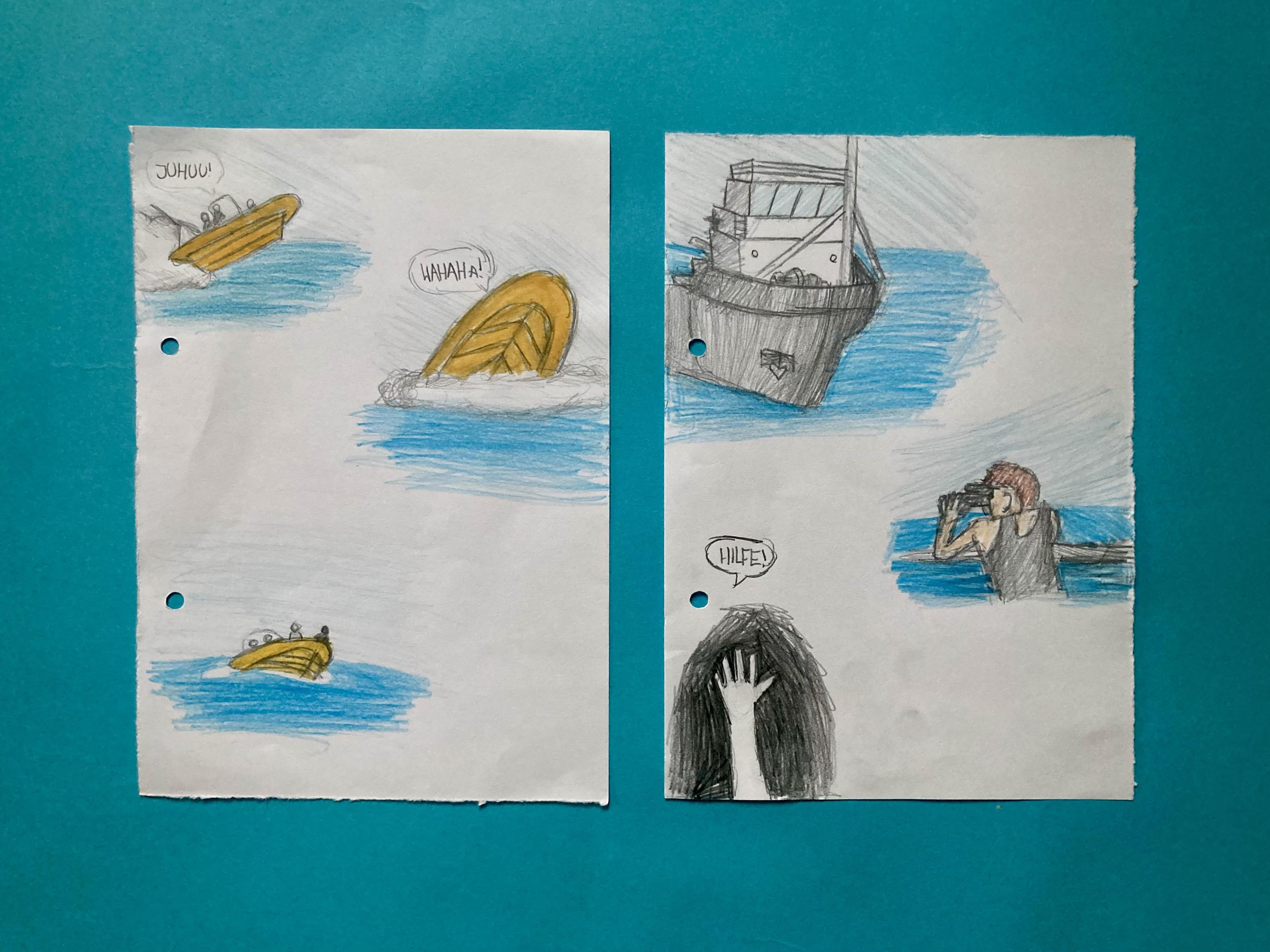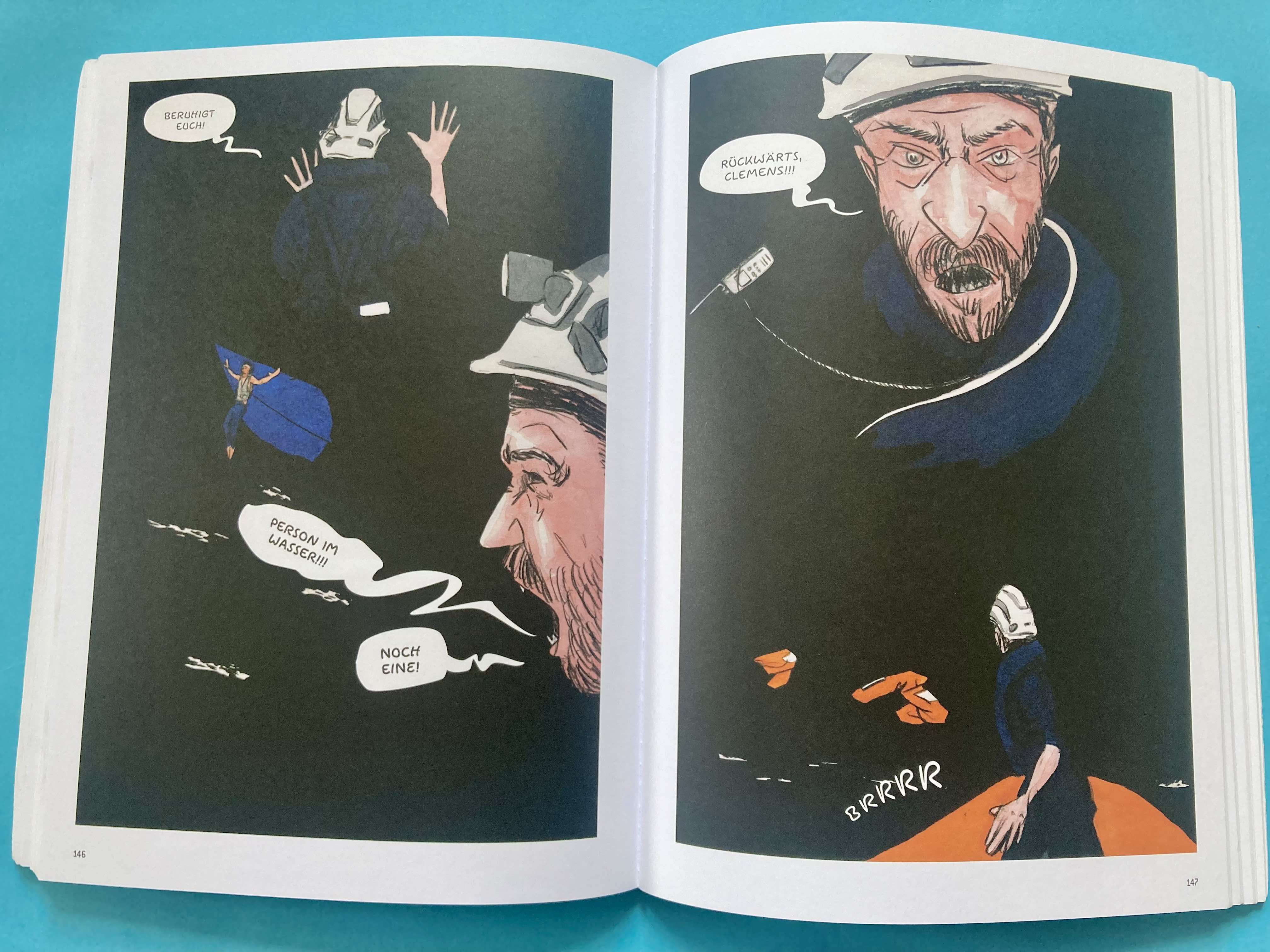 Das war eigentlich von vornherein klar. Ich habe nicht so ein großes Vertrauen in meine Schreibkünste gehabt und ich habe schon auf dem Schiff immer wieder meiner Erlebnisse aufgemalt und fand das sehr passend zu dem, was ich erzählen wollte. Von manchen Sachen, die während solcher Einsätze passieren, gibt es gar keine Fotos. Aber man braucht trotzdem Bilder davon. Gerade die dritte Rettung, die ich im Buch beschreibe, fällt in die Kategorie der schlimmsten Rettungen, die es auf dem Mittelmeer gibt. Bei diesen dramatischsten Rettungseinsätzen, wo überall Menschen im Wasser sind, gibt es für Fotojournalisten keine Möglichkeit, Fotos zu machen. Das liegt daran, dass jede Hand gebraucht wird. Jedes Mal, wenn so eine Rettung passiert ist, haben die Fotojournalisten ihre Kameras abgelegt und haben selbst mit anpacken, die Menschen aus dem Wasser zu ziehen. Um diese Szenen zu beschreiben, habe ich das Medium des Comics benutzt, um sichtbar zu machen, was dort passiert.