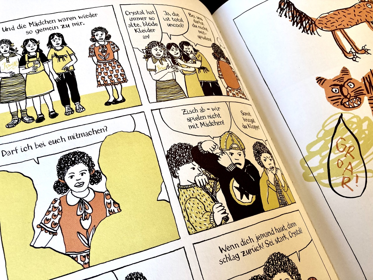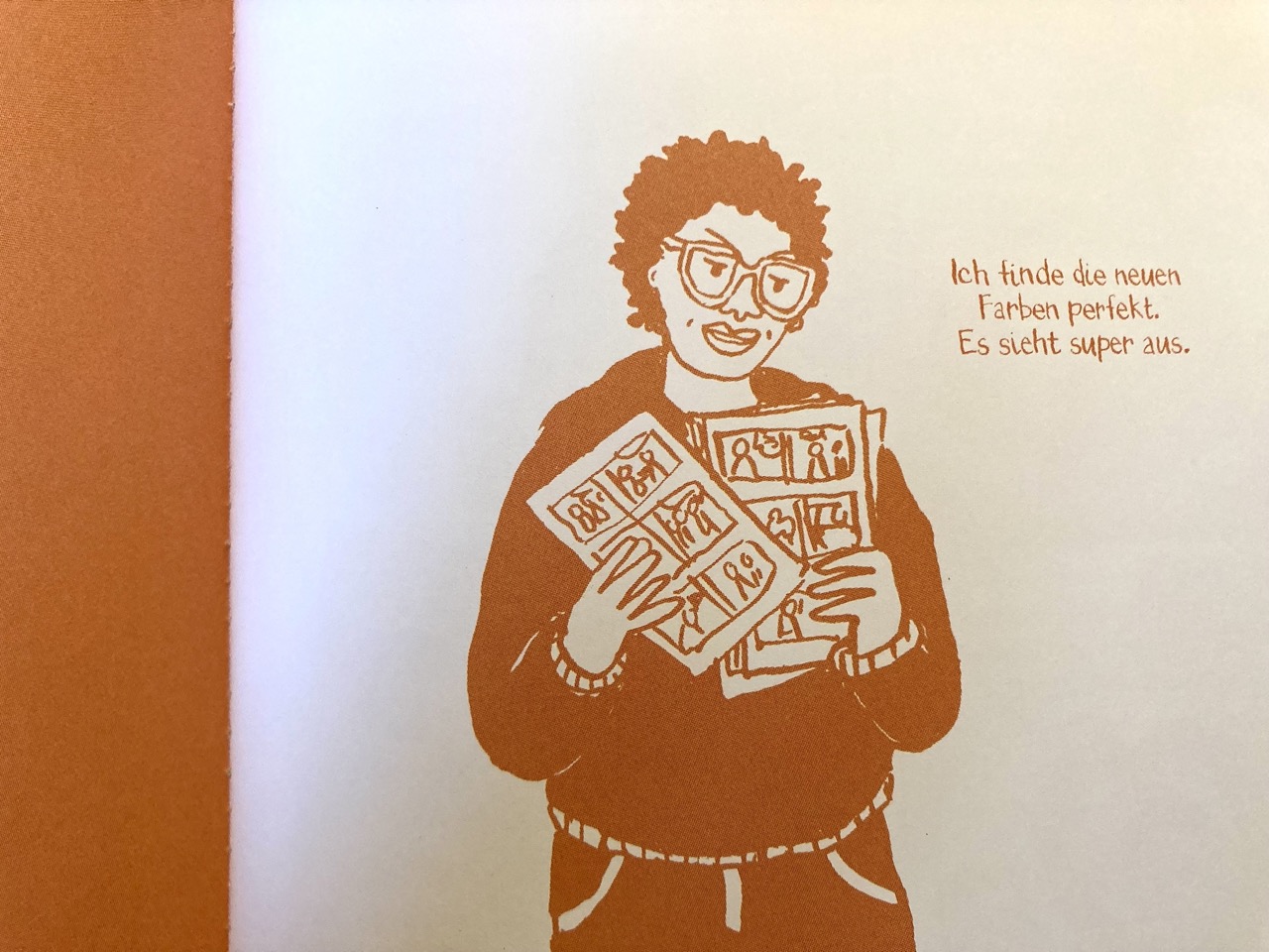 Crystal, also eigentlich Priscilla, macht ständig die Erfahrung, nicht dazuzugehören. Ich habe das Orange und das Grün gewählt, weil es unbequeme Farben sind. Das merkwürdige Grün ist eine Outsiderfarbe… Wie Rotz, etwas Unbequemes. Und Orange wird oft als Warnfarbe verwendet. Mein Vorgehen war ja so, das ich immer ein Kapitel gezeichnet und es Priscilla geschickt habe. Sie hat mir dann gespiegelt, was ich aus meiner weißen Sicht geschrieben habe, das eigentlich anders sein müsste. Deswegen sind diese Seite immer orange als Korrektur- und Warnfarbe.