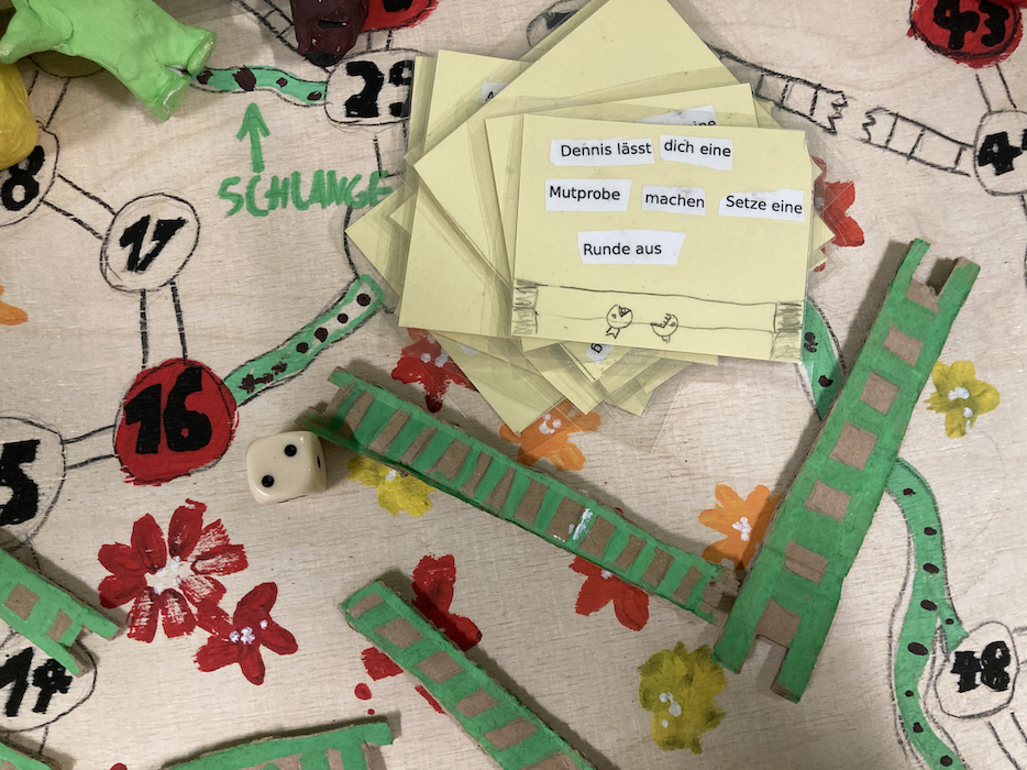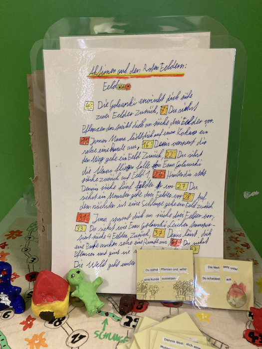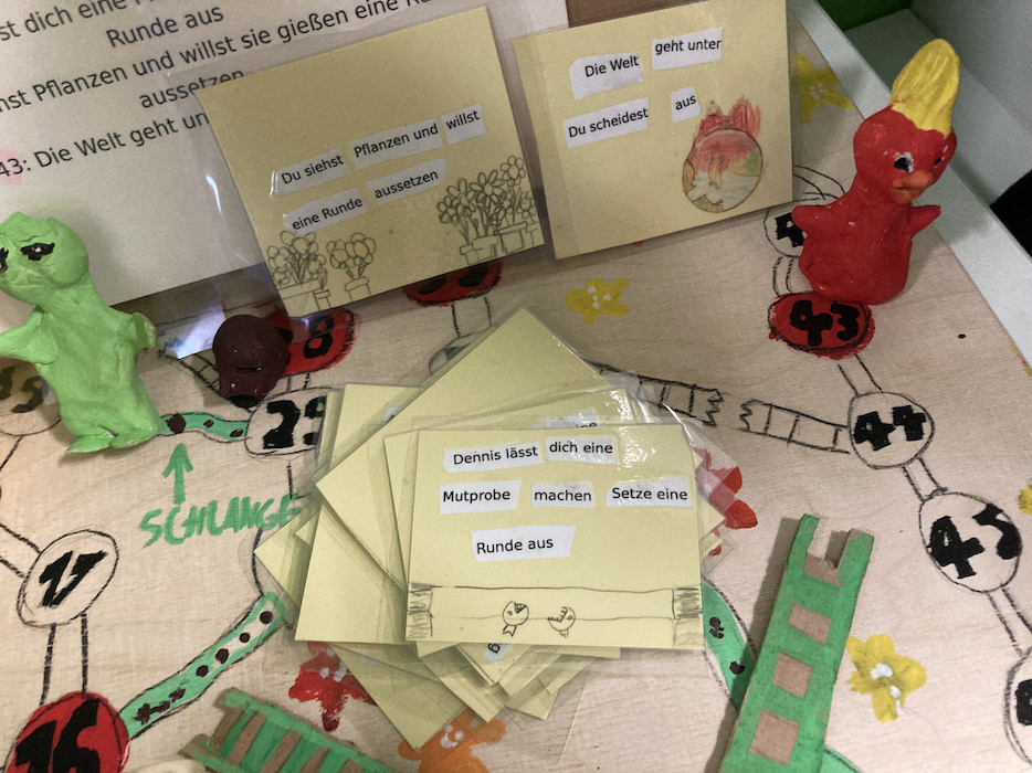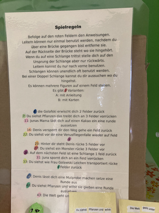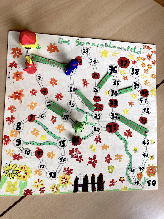 Bronco, Koala, Viktoria, Eliot und Caspar sind gemeinsam das Redaktionsteam „BLVEC Donuts“ und in einer beeindruckender Gemeinschaftsarbeit haben sie sich ein Spiel ausgedacht, das in Moritz' Garten spielt: „Das Sonnenblumenfeld“! Ein Leiter-Brettspiel, das richtig Freude macht. Unaufhörlich geht es hin und her und wer auf den schnellen Sieg hofft, hat sich meistens getäuscht. Kommt man auf ein rotes Feld, muss man eine gelbe Karte ziehen. Und diese Karten haben es in sich. Sie greifen die Figuren und Motive des Romans auf und ziehen daraus mal hilfreiche, mal brutale, aber eigentlich immer lustige Schlüsse: „Junas Mama lädt dich auf einen Kakao ein! Eine Runde aussetzen.“ Oder: „Hinter dir steht Denis! Rücke 5 Felder vor.“