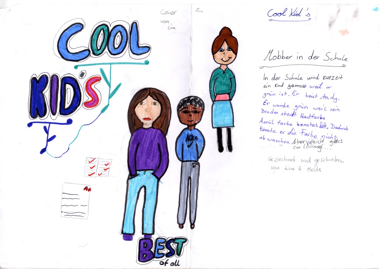 Auch Lina und Melda überlegen, wie sie dem grün angemalten Jungen aus „Cool Kid“ zur Seite stehen könnten. So wie echte Held*innen das nunmal machen.