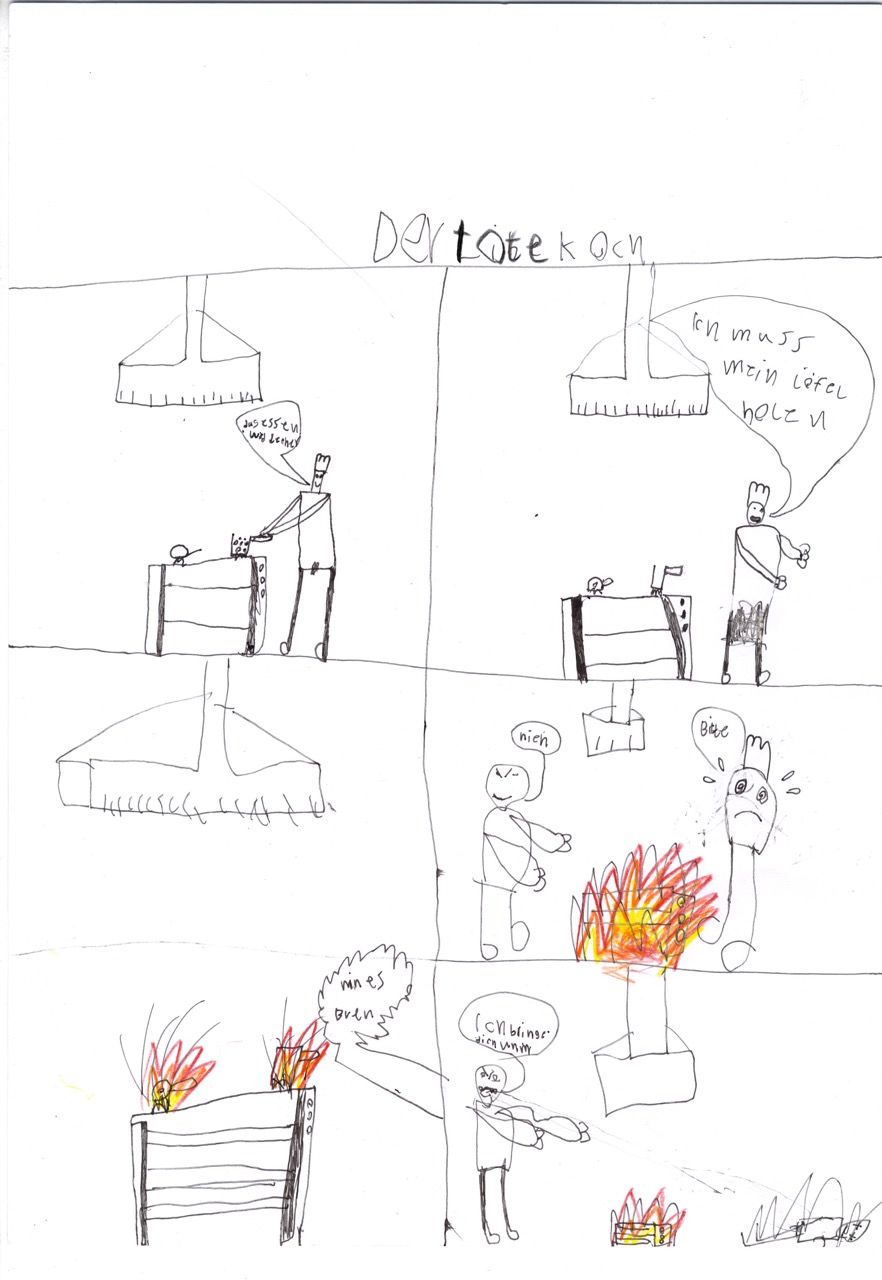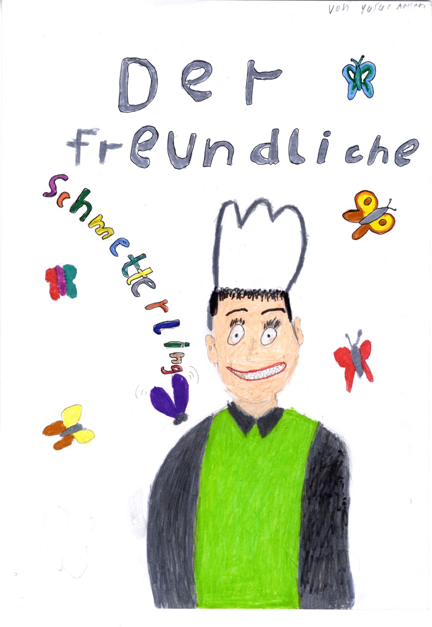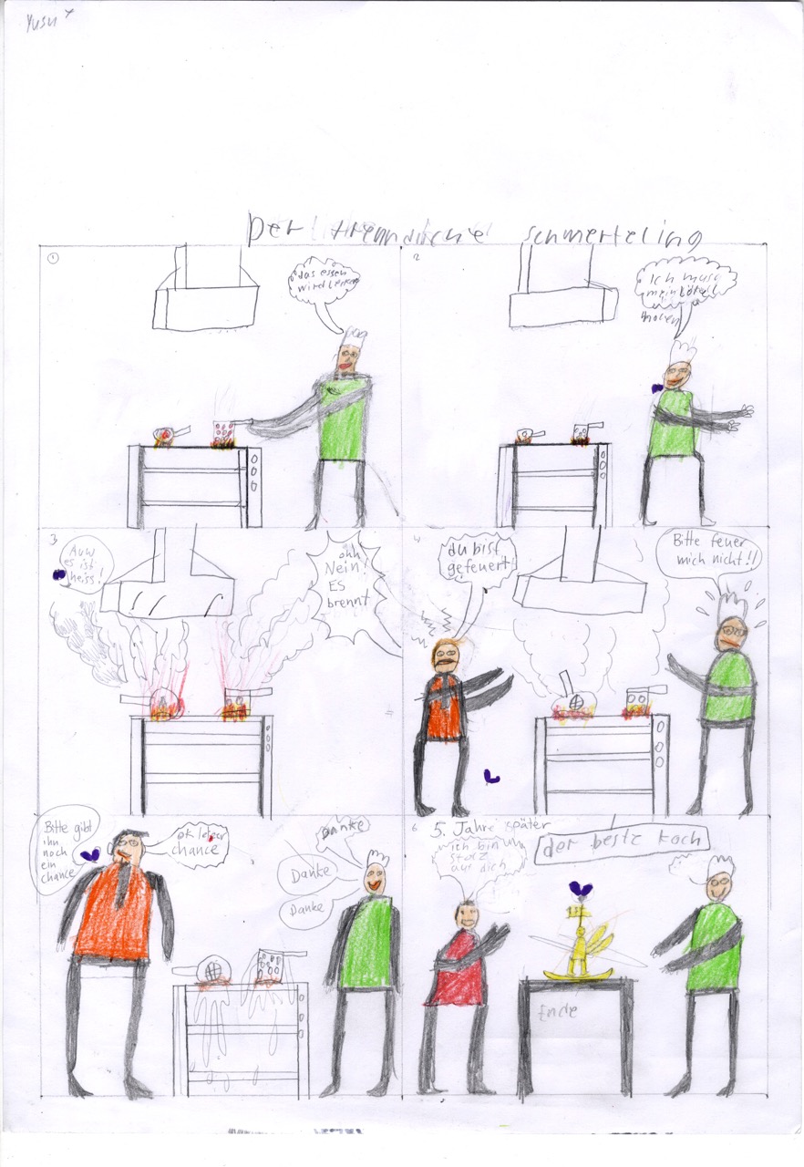 Yusuf und Mateo hingegen wollten sich lieber ihre ganz eigenen Geschichten ausdenken. Die Grundidee war die gleiche. Es geht in beiden Fällen um einen Koch, dem in der Küche ein kleines Missgeschick passiert. Doch was sie daraus machen ist ganz verschieden. In „Der freundliche Schmetterling“ verwandelt sich Yusuf in einen Schmetterling, um für den unglücklichen Koch ein gutes Wort einzulegen.