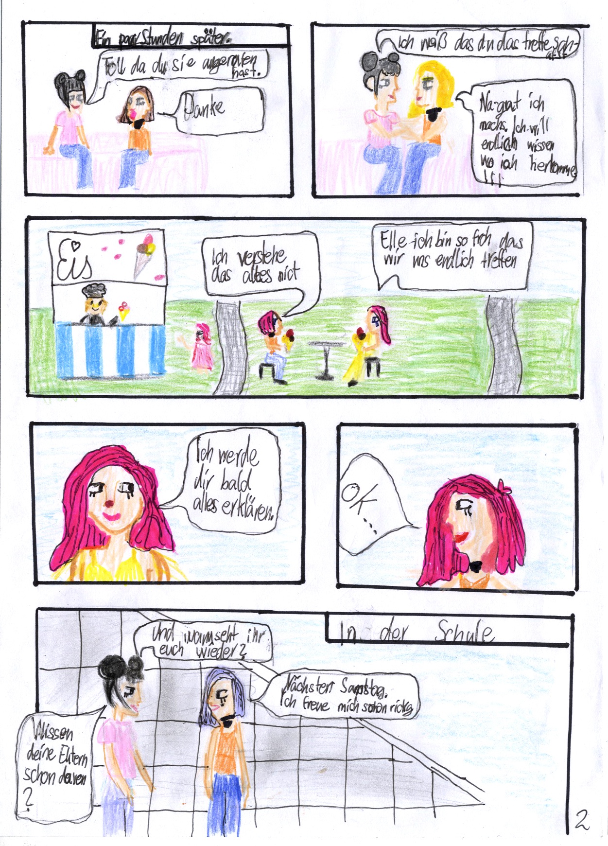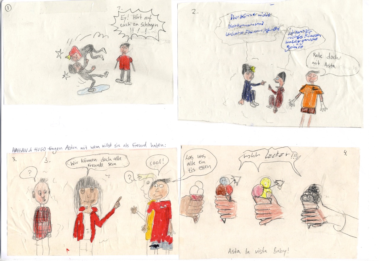 Auf der Grundlage von echten Comics haben sie überlegt, welche Rolle sie selbst in den Geschichten spielen würden. Also zeichneten sie eine Schlüsselszene neu. Diesmal mit anderen Protagonist*innen: sich selbst. Hier sind die Abenteuer von Amin, Dustin, Lina, Melda, Yusuf, Mateo, Lou, Hasan, Karlo, Junes und Cauri.