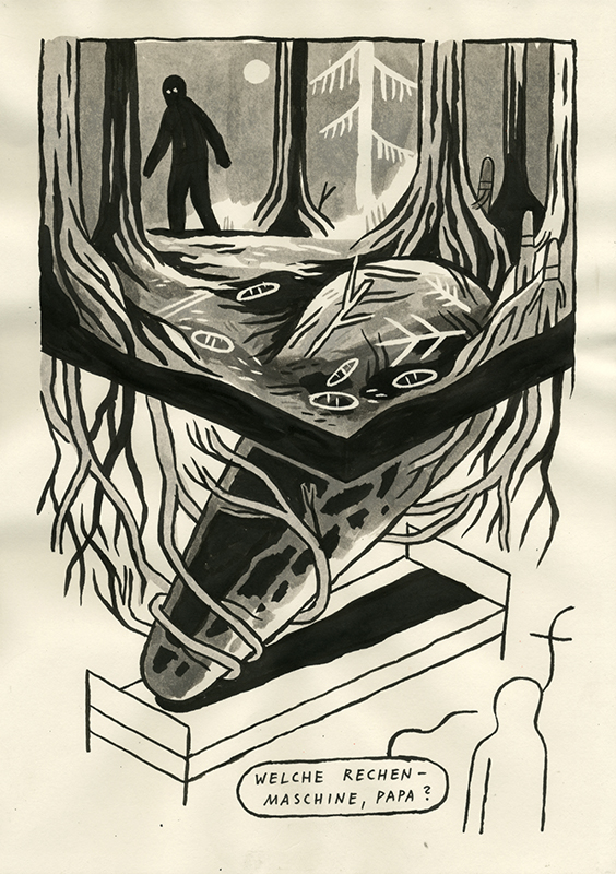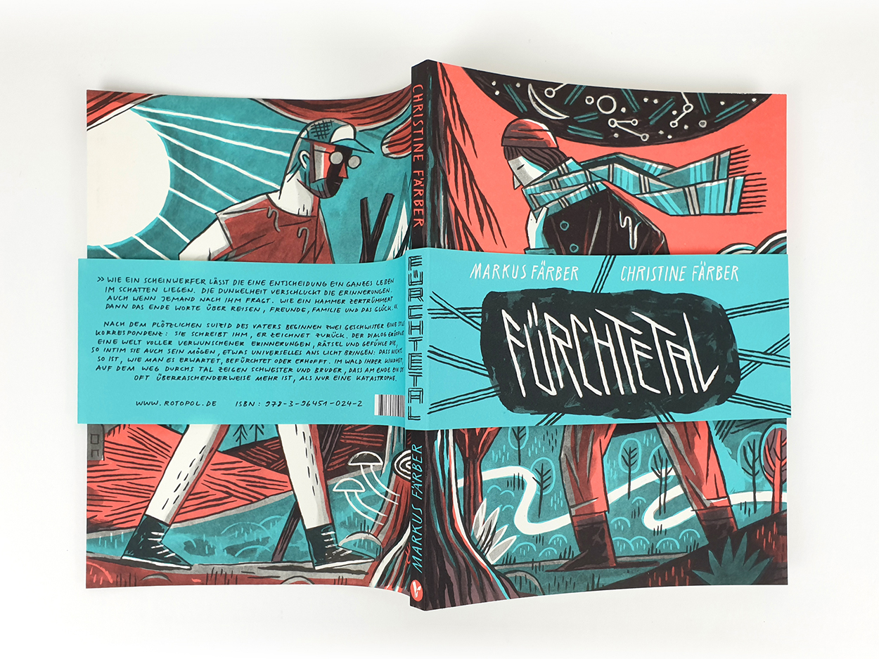 Ich glaube, es hilft, wenn man darüber informiert ist, wie dieses Buch entstanden ist. Es fing als eher Dogma-inspirierter Dialog zwischen Geschwistern an, ohne dass es darum ging, das alles später auch in Buchform präsentieren zu können. Da ging es uns in erster Linie darum, zwischen uns einen Kommunikationsprozess ins Rollen zu bringen, da sich jeder von uns nach der Nachricht des Selbstmords in sein inneres Exil flüchtete. Christine fing an, mir einzelne Sätze zu schicken, die ich dann zeichnerisch umsetzte … das diente in erster Linie dazu, mit dem Geschehenen irgendwie besser umgehen zu können. Zu diesem Zeitpunkt war nicht daran zu denken, dass daraus dann später mal ein Buch wird. Dieser Prozess kam ins Rollen, da Rotopol – der Verlag, bei dem ich bereits meine erste Graphic Novel „Reprobus“ veröffentlichte – und ich über die Möglichkeit weiterer gemeinsamer Projekte ins Gespräch kamen. Für meine Schwester und mich ergab sich so eine Möglichkeit, zum ersten mal Feedback von außen zu bekommen – und da dieses sehr positiv war, kam es schlussendlich zum Buch. Ich glaube, die Entstehung hat „Fürchtetal“ in die Karten gespielt: Diese sehr direkte, dabei recht abstrakt gehaltene Geschichte wurde von uns geformt, ohne dass man zunächst an eine Veröffentlichung dachte. Und das ist auch der Grund, warum es in der Geschichte klar um unseren Vater geht, dieser dabei jedoch nicht zwingend als Person im Zentrum steht. Es ist halt keine Erinnerungsarbeit, wo er als Mensch mit halbwegs intakter Biografie beleuchtet wird, sondern im weitesten Sinne Trauerverarbeitung – die dementsprechend auch gar nicht konkret dargestellt werden kann. Da wäre es uns wichtiger gewesen, bestimmte Dinge im Nachwort zu konkretisieren … (lacht) aber das hat dann aus organisatorischen Gründen nicht ganz hingehauen und so steht die Geschichte nun für sich, was glücklicherweise sehr gut funktioniert. Kunstwerke sollten ja auch nicht zwingend durch Erklärungen ergänzt werden, das darf dann gerne jeder für sich selbst deuten.