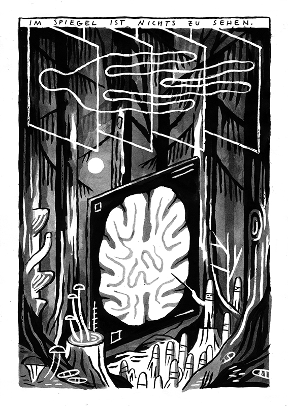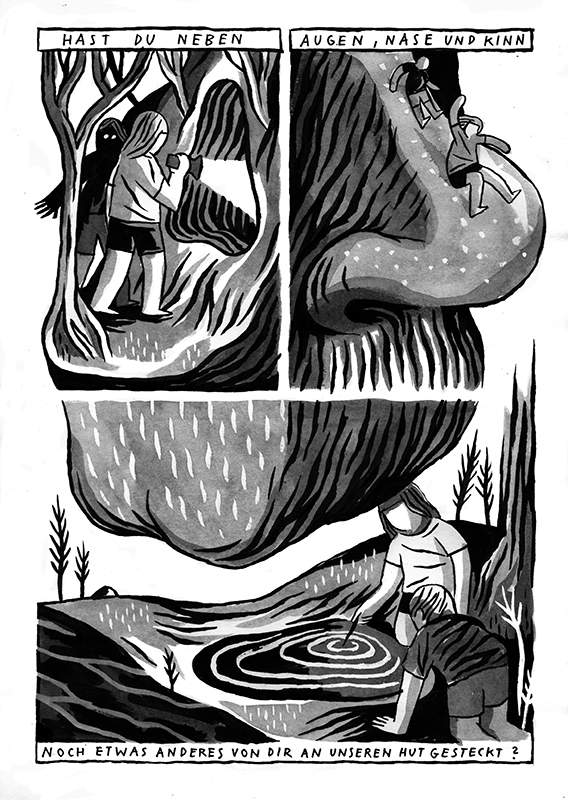 Einerseits fühlt es sich ehrlich gesagt ein wenig sonderbar an, da ich „Fürchtetal“ nicht als Jugendbuch begreife. Die Rubrik “Neue Talente“ empfinde ich ebenfalls als eher schwierig, da ich das alles ja schon seit einiger Zeit mache … (lacht) da war ich dann beruhigt, dass Max Baitinger ebenfalls in dieser Kategorie nominiert wurde, der ist ja gleichermaßen kein wirklicher Newcomer mehr. Andererseits freue ich mich natürlich über die Aufmerksamkeit, die unser Buch nun erhält, dass es als generationsübergreifende Geschichte verstanden wird. In Folge dessen wird das Buch viel herumgereicht, es gibt plötzlich Workshops an Schulen über den Titel und die verbundenen Themen. Das ist natürlich spannend, weil es ja impliziert, Bilder und Wörter gefunden zu haben, die auch für eine jüngere Generation interessant sind, mit einem Thema nach außen geht, dass man auch Jüngeren zumuten kann. Mir ist es ehrlich gesagt auch lieber, „Fürchtetal“ in der Jugendbuchecke eines Buchladens zu sehen, als in der Comicecke.