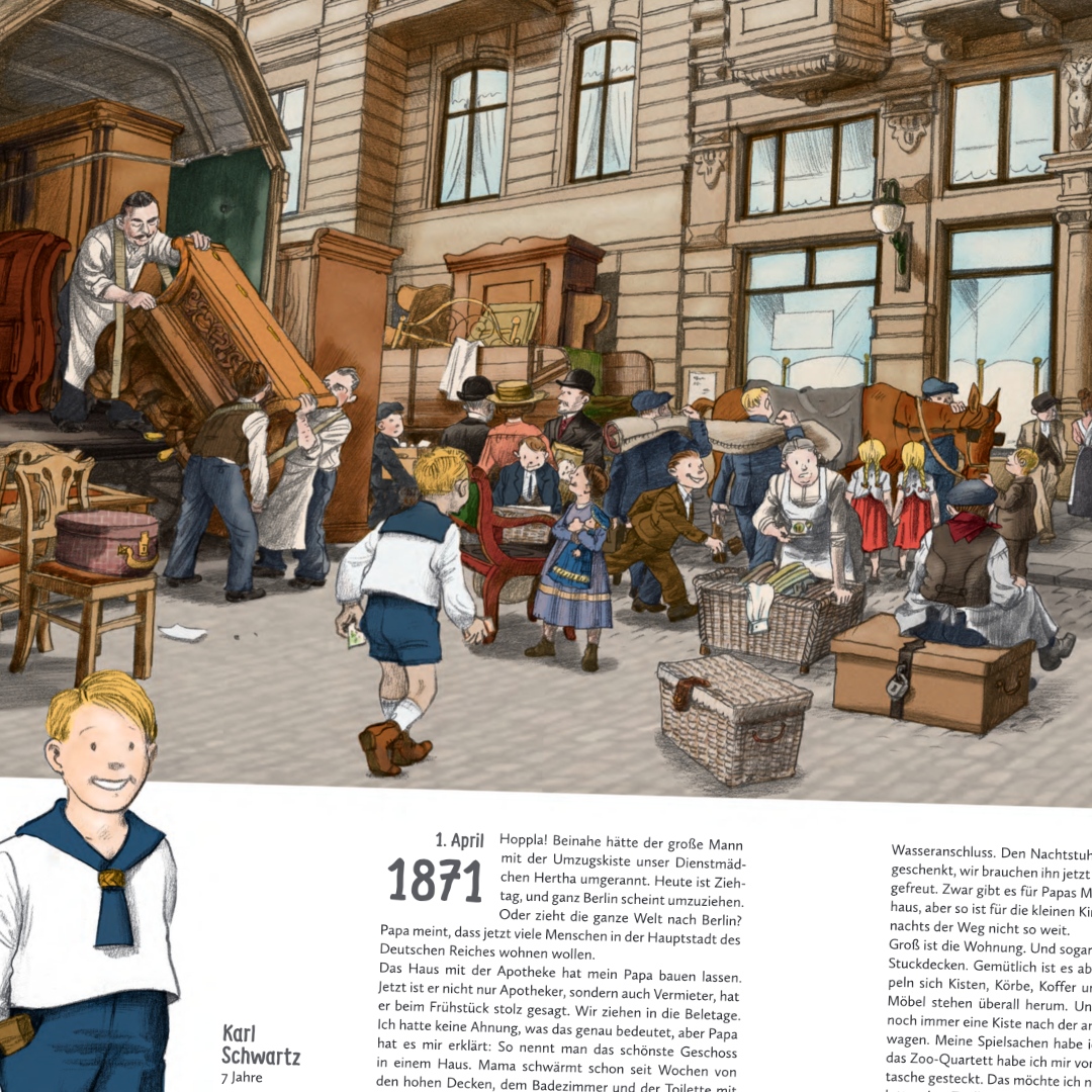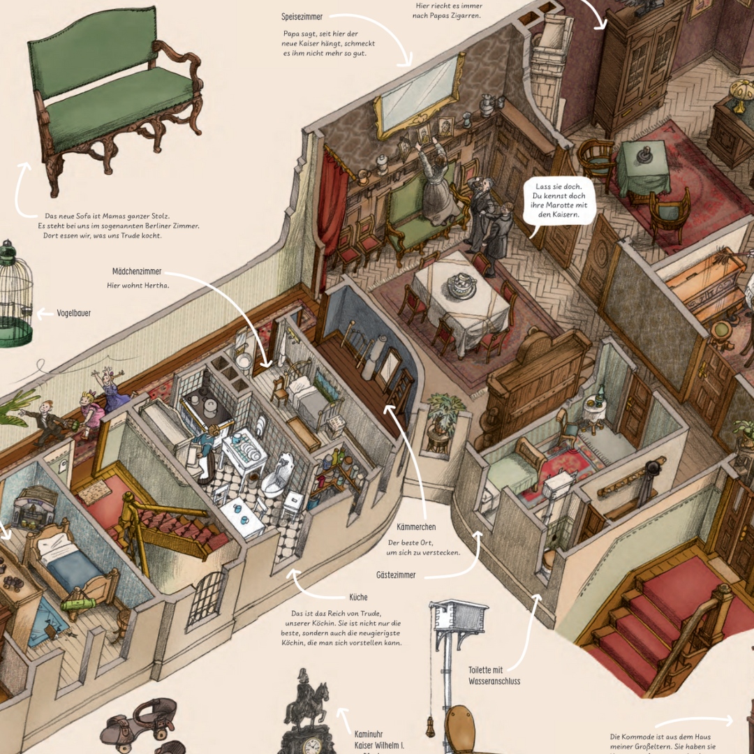 Das Buch war eine Auftragsarbeit vom Gerstenberg Verlag. Der Verlag hat mit dem Stadtmuseum in Berlin einen Kooperationsvertrag geschlossen. Er hatte vorher schon ein ähnliches Buch herausgebracht. Es heißt „In einem alten Haus in Moskau“. So ein Buch wollten sie auch für Deutschland machen. Also sind sie losgezogen und haben überlegt, wer die Objekte für das Buch liefern könnte. Ihr habt ja gesehen, wie viele Objekte in dem Buch gezeigt werden, um die Geschichte des Hauses zu erzählen. Diese Dinge gibt es tatsächlich auch in echt. Sie sind in diesem Museum zu finden. Manche davon werden in der Ausstellung gezeigt, ganz viel lagern im Depot. Der Verlag hat sich also an das Stadtmuseum gewendet und gefragt, ob es nicht Kooperationspartner bei diesem Buchprojekt sein möchte. Gleichzeitig haben sie gefragt, ob das Museum jemanden kennt, der das Buch schreiben könnte. Das Museum hat an mich gedacht, weil ich mich mit dem Thema auskenne und schon immer gerne erzählerisch gearbeitet habe. Der Verlag hat mich angerufen und gefragt, ob ich mitmachen möchte. Auf die Frage, ob ich Beispieltexte einreichen kann, habe ich nein geantwortet, weil ich noch nie ein Kinderbuch geschrieben habe. Die Texte aus dem Museum waren als Beispiel nicht geeignet. Deshalb habe ich stattdessen vorgeschlagen, das erste Kapitel sozusagen als Probetext einzureichen.