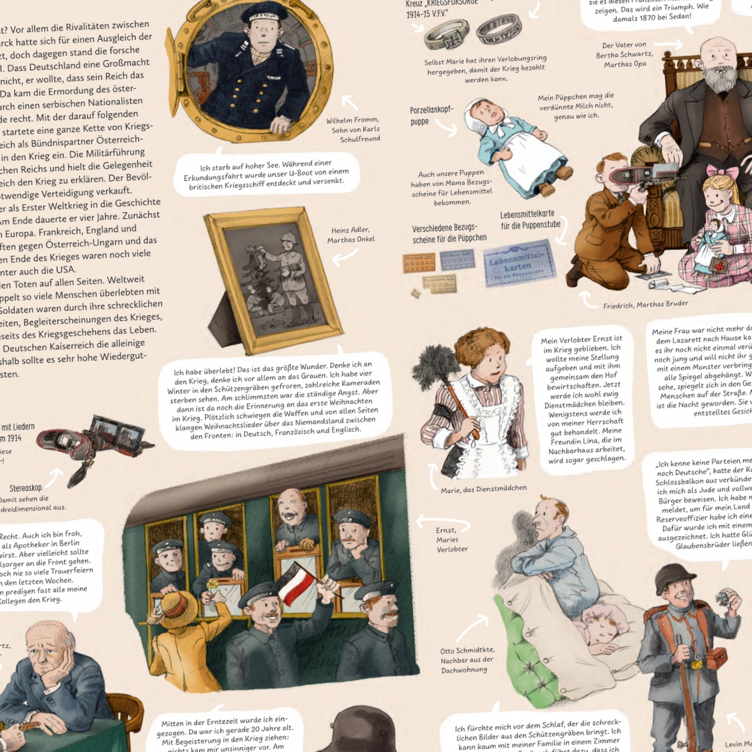 Ich habe das Buch angefangen zu schreiben, da war mein Kind erst ein paar Monate alt. Im letzten Jahr ist es fertiggeworden, da war mein Sohn schon fünf. Ich habe also vier Jahre an dem Buch gearbeitet. Es wäre bestimmt schneller gegangen, wenn ich mich voll darauf konzentriert hätte. Aber ich habe das Buch neben meinem Beruf am Wochenende und im Urlaub geschrieben. Ich musste außerdem feststellen, wie fürchterlich schwierig es ist, über Dinge wie den Ersten oder Zweiten Weltkrieg in so kurzer Form zu schreiben. Bei jedem Wort musste ich überlegen, ob man das als Kind verstehen kann. Ich muss gestehen, dass es mir manchmal nicht ganz leicht fällt, kindgerecht über diese Themen zu schreiben. Die Sprache, mit der ich mich sonst beschäftige, besteht aus vielen Fachwörtern. „Fachtermini“, sagt man dazu, wenn man das studiert hat. Das musste ich alles beiseite lassen und überlegen, wie ich es so schreiben kann, dass es möglichst jeder versteht. Das ist gar nicht so einfach.