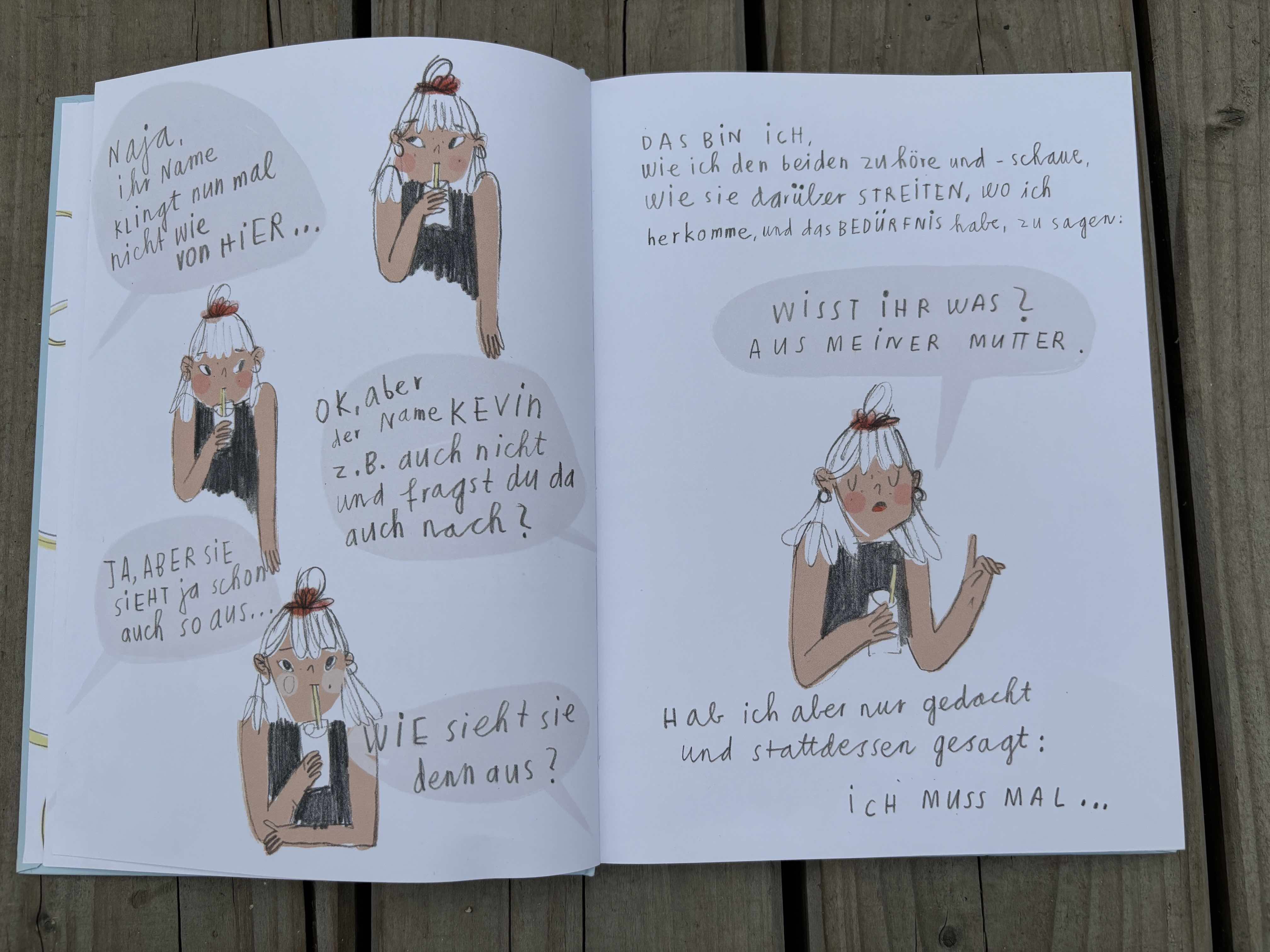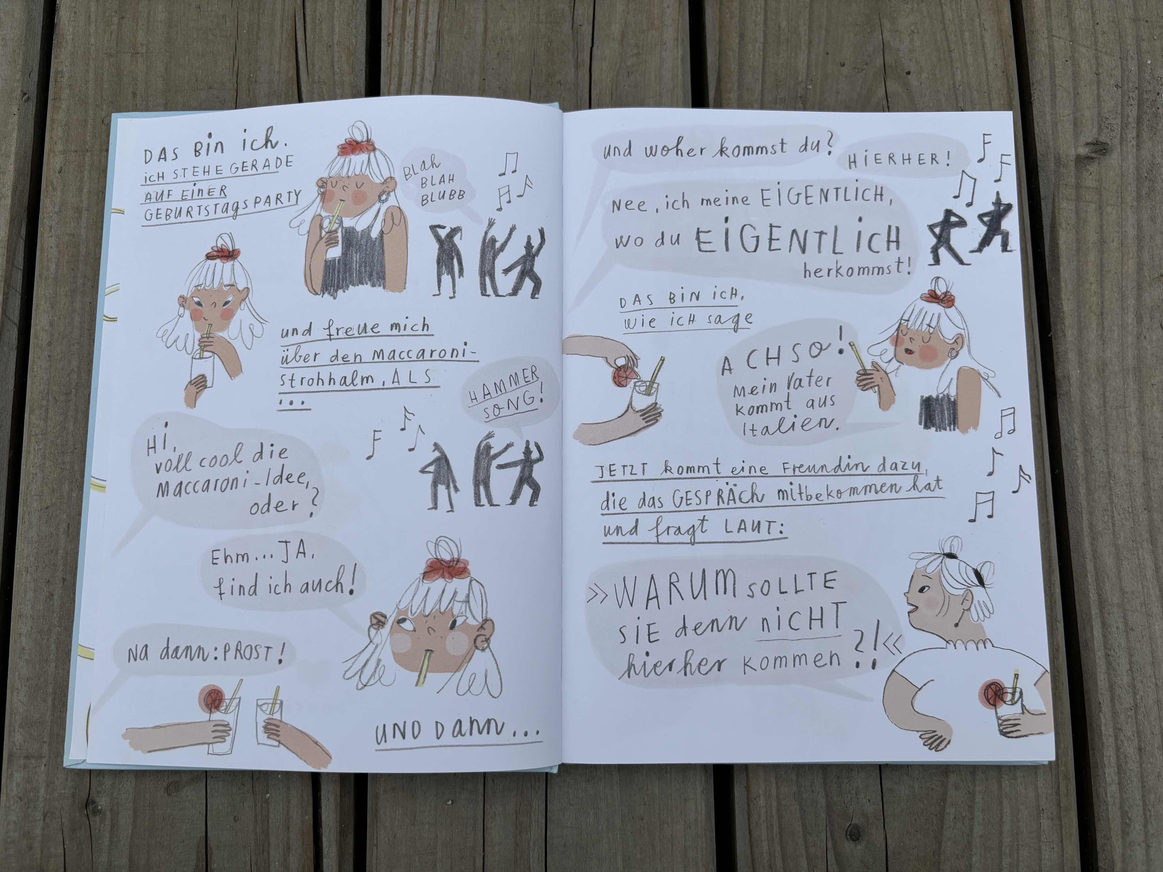 Der Anstoß für „Jeden Tag Spaghetti“ war eine Begegnung bei einer Preisverleihung bei der Frankfurter Buchmesse. Ich habe einen Preis für mein erstes Buch („Rot ist doch schön“/Bohem Press) bekommen und war ganz aufgeregt. Als ich von der Bühne kam, wurde ich von einer Frau angesprochen, die sagte, sie würde für irgendeine Zeitung schreiben. Ihre erste Frage war, wo ich herkomme. Ich sagte aus Münster, das ist eine Stadt in Nordrhein-Westfalen, ganz nah an der holländischen Grenze. Doch sie fragte nach, wo ich denn eigentlich herkomme. Diese Frage kannte ich. Ich fand das total nervig! Ich wollte nur mein Buch vorstellen, das gar nichts mit Herkunft zu tun hat. Und trotzdem werde ich wieder danach gefragt und es war dann auch Teil ihres Artikels. Das hat mich geärgert und war der Anlass für die Idee zu „Jeden Tag Spaghetti. Allerdings hat es dann noch gedauert, bis ich ein Buch daraus gemacht habe, weil ich das Thema erst mal für mich selber bearbeiten wollte. Ich musste überlegen, wie ich das Ganze überhaupt in ein Buch bekomme und welche Geschichten ich da hineinpacken möchte.