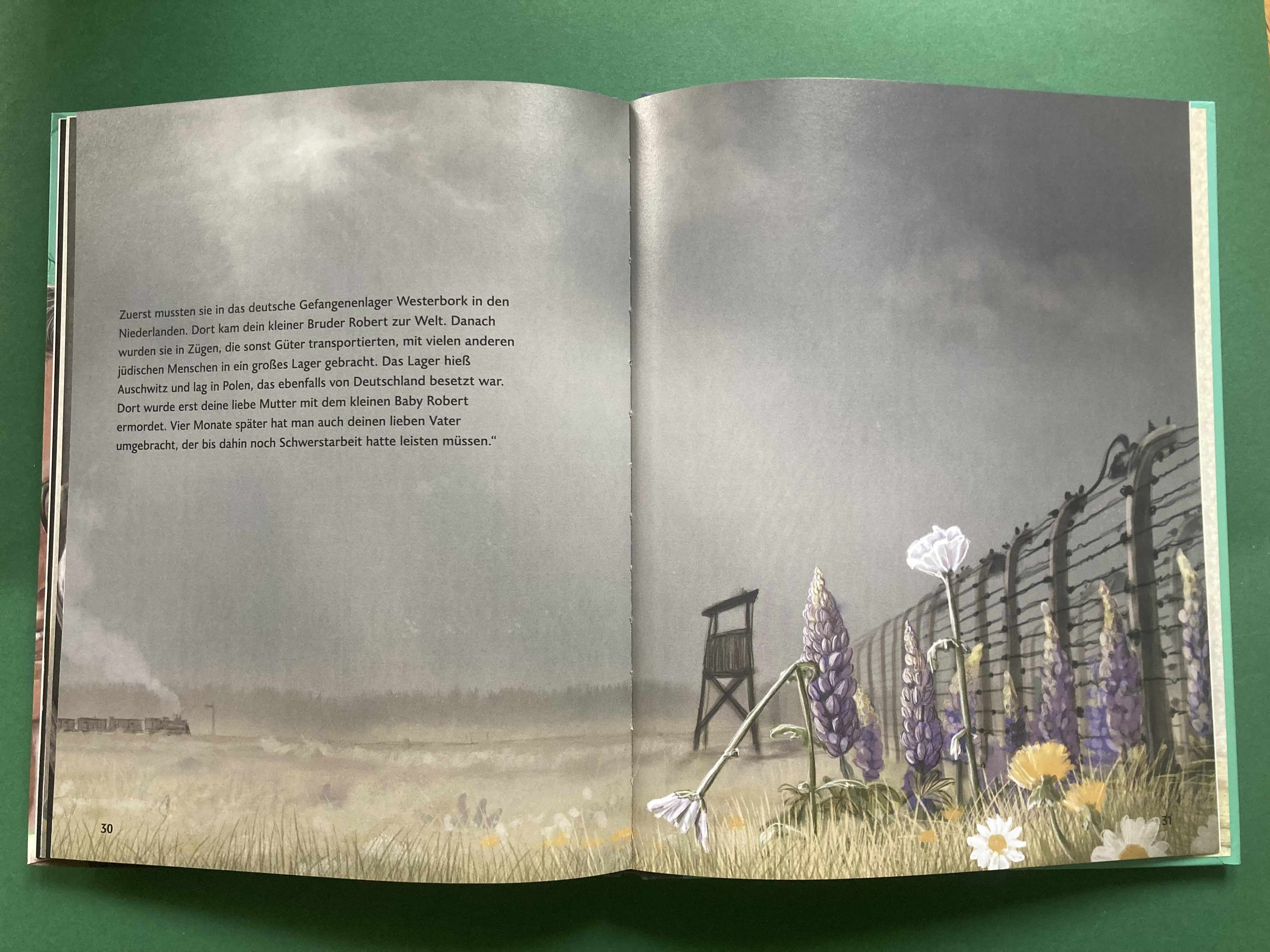 Rozette Kats: Und das habe ich getan. Im Wohnzimmer saß ich in einem großen Sessel und die Kinder haben sich vor mich auf den Fußboden gesetzt. Und ich habe angefangen zu erzählen. Das war ein Ereignis, das ich in meinem Leben niemals vergessen werde. Lutz hat diese Situation für sein Buch als Inspiration genommen.
