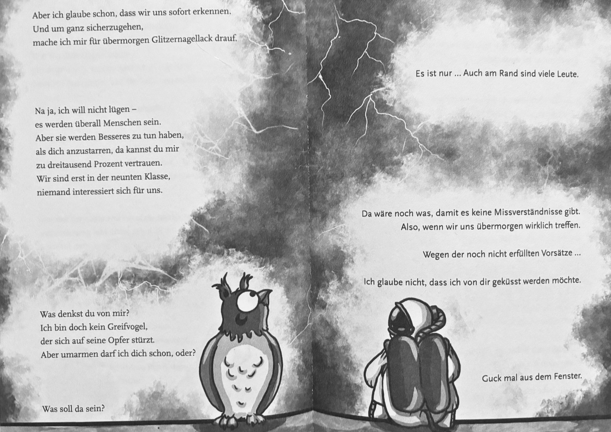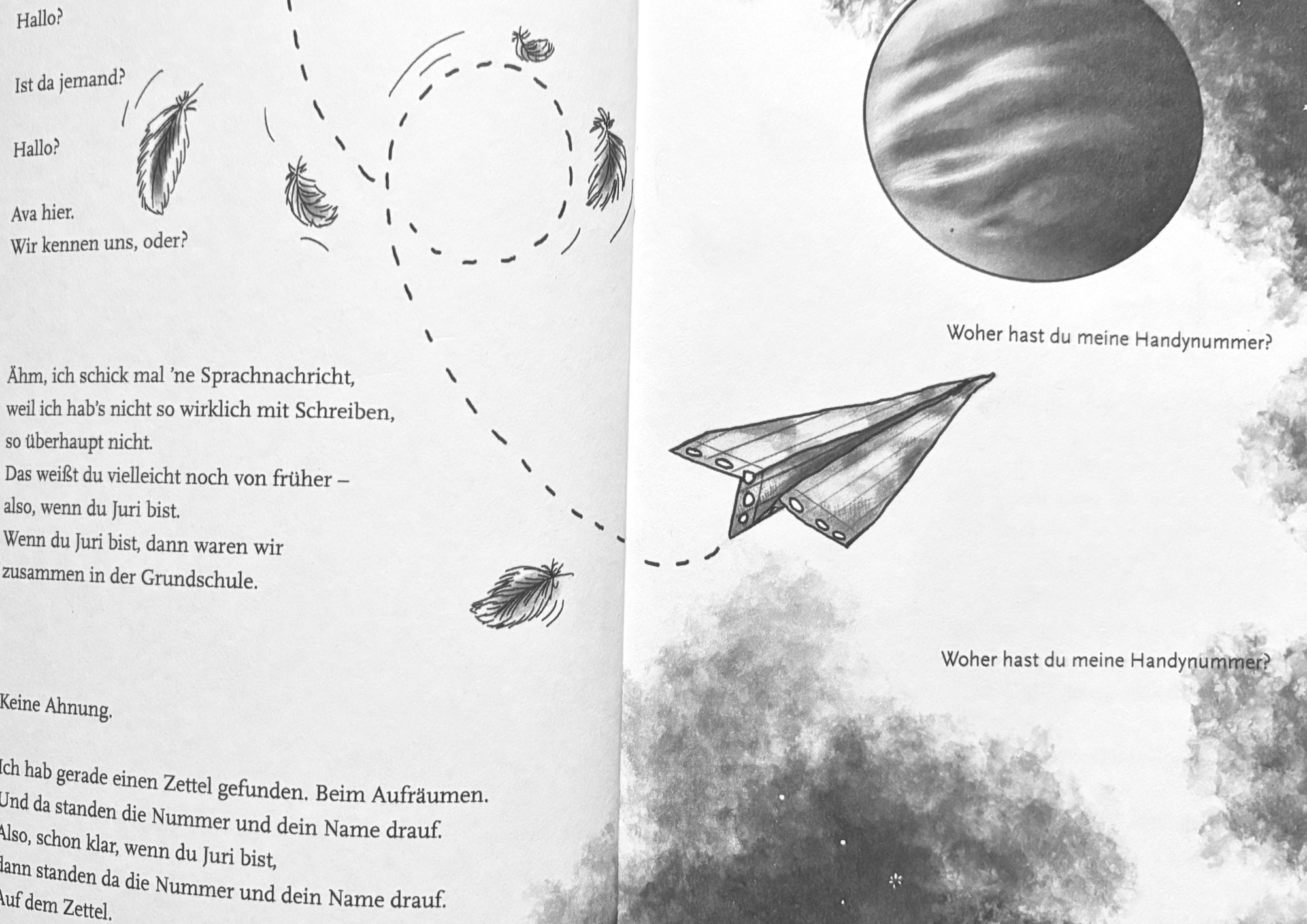 Das hat viel damit zu tun, dass ich davor drei „normale“ Romane geschrieben habe. Ich wollte mich nicht wiederholen und lieber etwas anderes ausprobieren. Das war zum einen die neue Form. Außerdem hatte ich keine Lust, immer allein zu arbeiten. Schreiben ist eine ziemlich einsame Tätigkeit. Sarah Maus kenne ich schon, seitdem sie 14 ist. Sie war Teilnehmerin in meiner Theater-AG und hat Kunst studiert. Ich habe sie gefragt, ob sie Lust auf ein Experiment hat. Wir haben uns zusammengesetzt und überlegt, was wir machen wollen. Wir wussten, dass es ein Roman werden soll, der aus Text und Illustration besteht. Aber wir hatten noch keine Idee, was am Ende dabei herauskommen sollte.