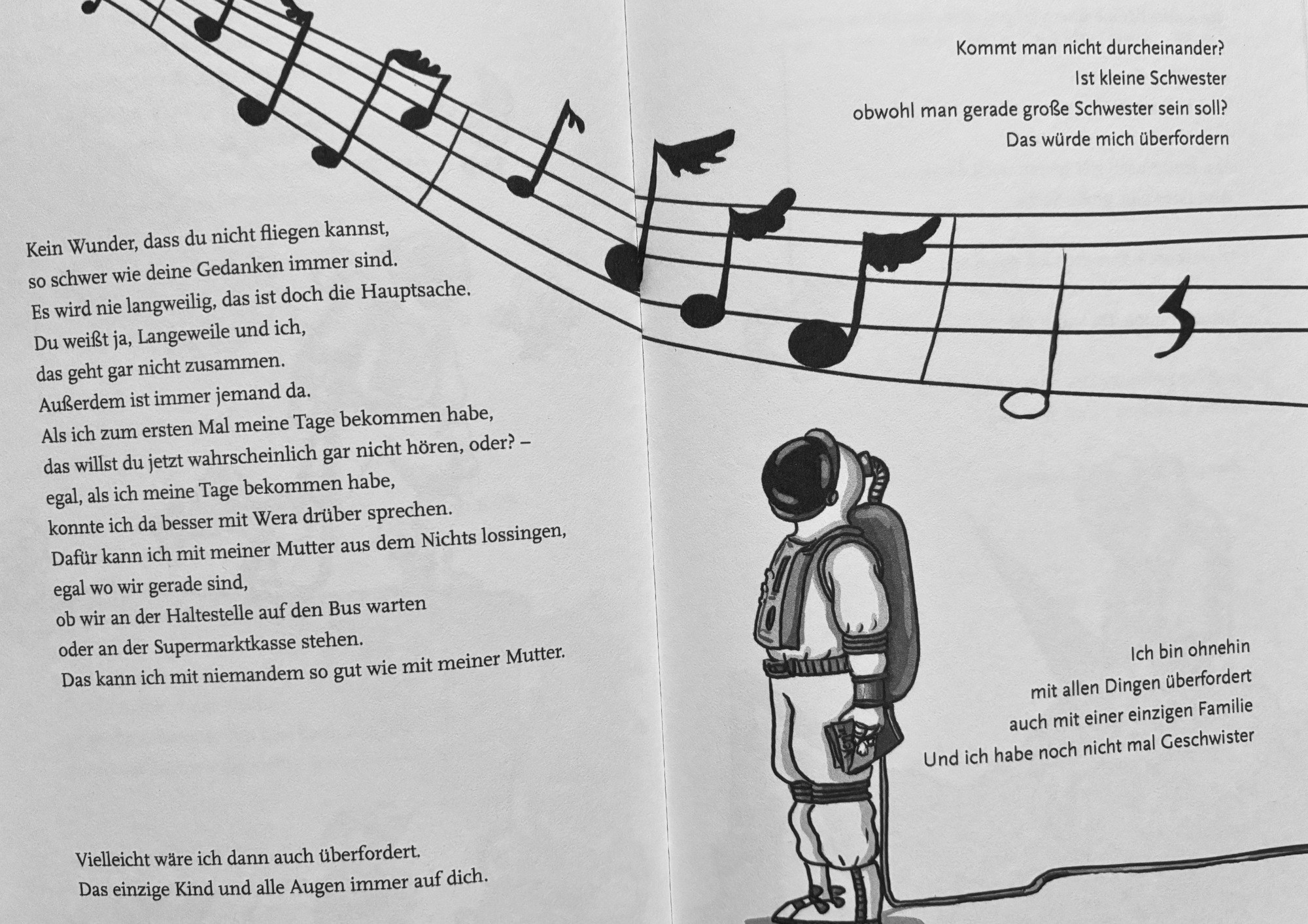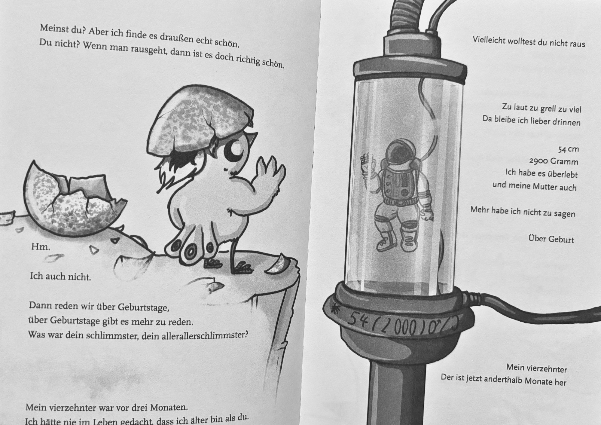 Sarah Maus hat die Illustrationen gemacht, und ich habe den Text geschrieben. Am Anfang haben wir gemeinsam Ideen gesammelt. Worum könnte es gehen und was für Figuren kommen vor? Den „Astronaut“ als Figur haben wir schon bei unserem ersten Treffen gefunden. Doch was können wir mit dieser Figur erzählen, die sich nicht so wohl fühlt in dieser Welt und Angst vor ihr hat? Da hatte ich die Idee, dass es um einen Dialog zwischen zwei Figuren gehen könnte. Und so entstand der „komische Vogel“. Langsam entwickelte sich die Idee, dass sich immer zwei Buchseiten gegenüberstehen: eine Seite mit der Lebenswelt des Astronauten und die andere mit der Lebenswelt des komischen Vogels. Sarah Maus hat mit ihren Illustrationen diese Lebenswelten noch anschaulicher gemacht.