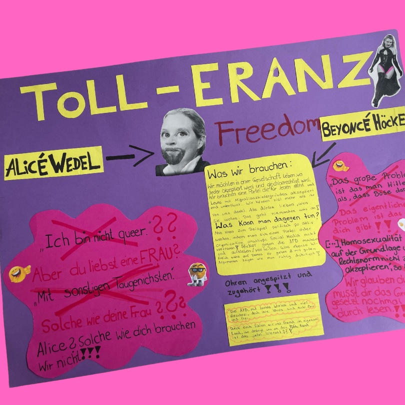 Wir haben das Buch „You don't look gay“ von Julius Thesing gelesen. Wir haben das Kapitel „Zurück an den Herd“ gelesen. In diesem Kapitel ging es großteils um die AFD, da sie gegen die Homosexualität sind und gegen Ausländer. Dazu haben wir ein Plakat gestalten, wo die Themen ausführlich dran kommen. Die AFD braucht man nicht, da sie sich gegen das Grundgesetz stellen. Die Überschrift haben wir passend zum Thema Toleranz gemacht. Zwischen den beiden Wörtern haben wir ein Bindestrich gesetzt, da jeder Mensch TOLL ist.