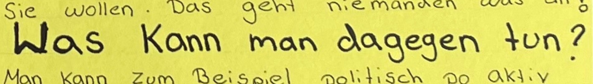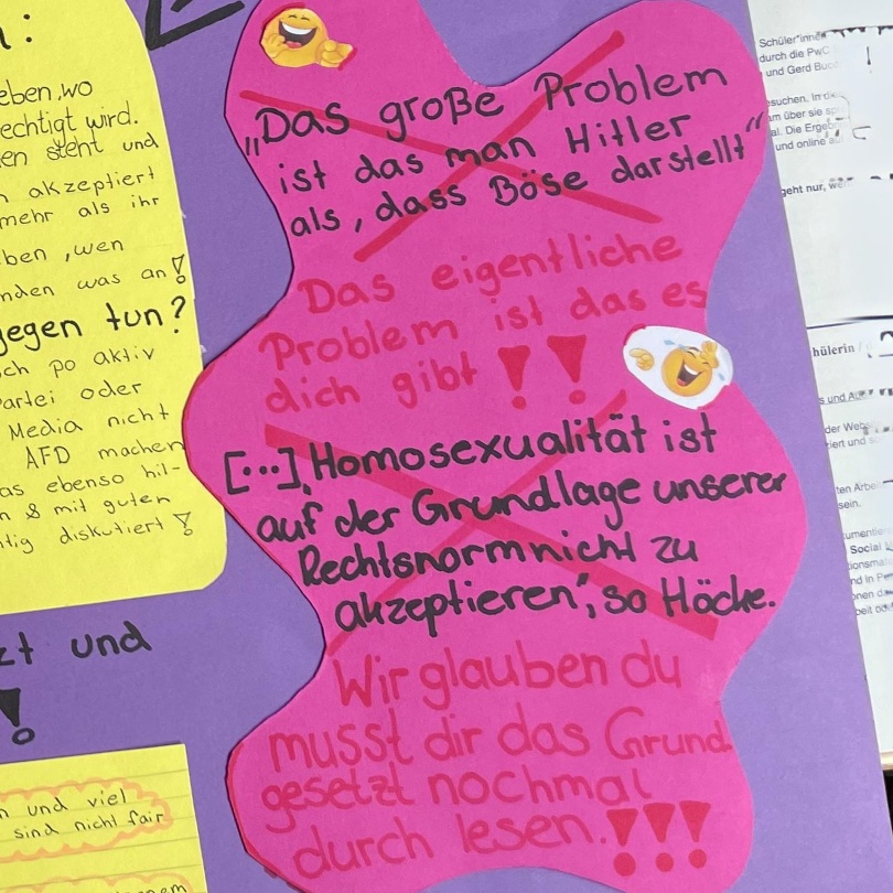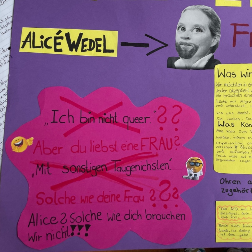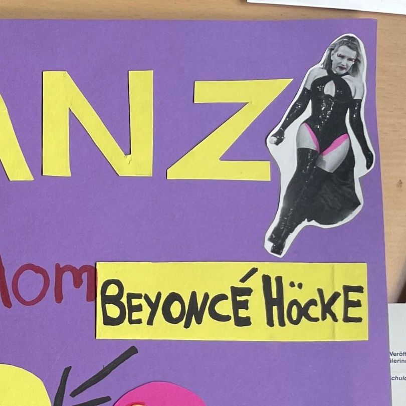Die Lady rechts oben ist Björn Höcke. Sein Name haben wir zu Beyoncé um benannt. Beyoncé steht für Freiheit und das zeigt sie auch auf ihren Konzerten. Alice Weidel haben wir den Namen „Alice Wedel“ gegeben, da es gut zu ihr passt. Wedel ist eine langweilige Stadt neben Hamburg, die keiner braucht… Wir haben uns Aussagesätze von Alice und Björn Höcke ausgesucht und sie korrigiert. Ebenso haben wir Reime gegen die AFD geschrieben und Tipps gegeben und formuliert, was wir eigentlich in Deutschland gebrauchen könnten.