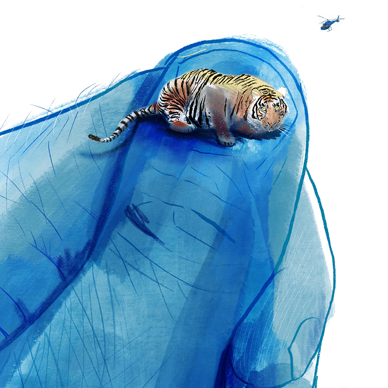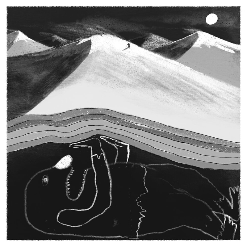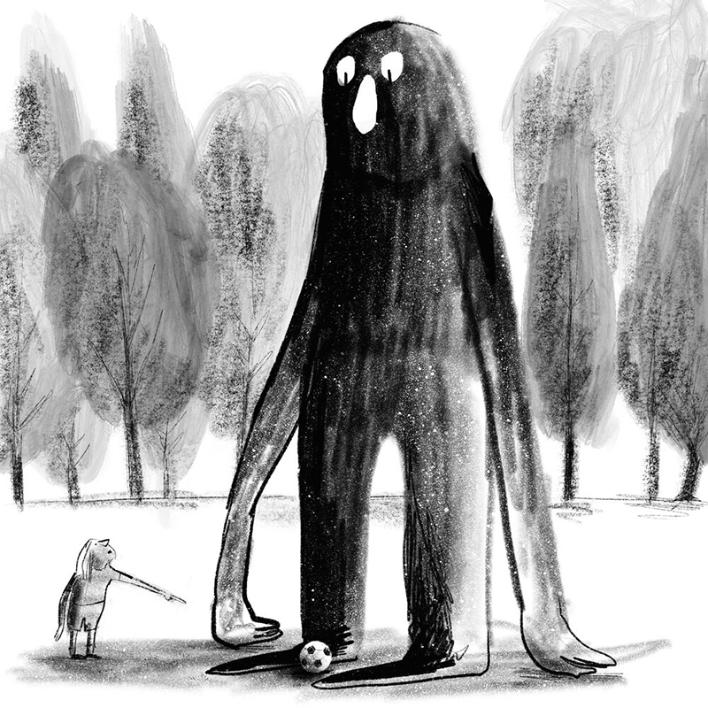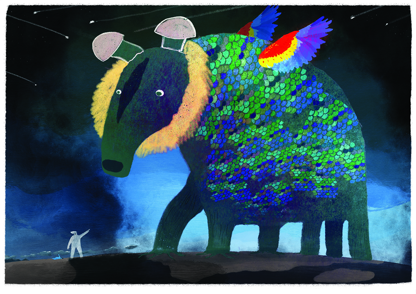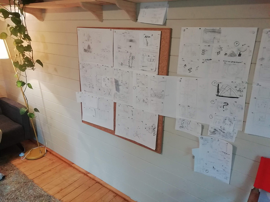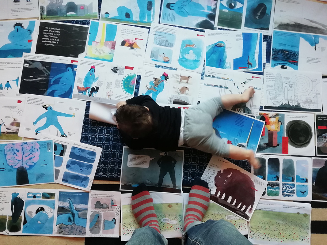 Am Anfang fühlte es sich ziemlich seltsam an, über diese Größenverhältnisse nachzudenken. Aber bald realisierten wir, dass dieser gewaltige, dabei jedoch recht plumpe Mega-Mensch ein interessantes Bild abliefert, um eine Geschichte davon zu erzählen, welche Auswirkungen unser kombiniertes Handeln auf den Planeten hat - im Guten wie im Schlechten. Der Großteil der Illustrationen des Buchs ist übrigens während des Lockdowns entstanden. Glücklicherweise wurde ich gerade mit dem Bau einer kleinen Hütte am Ende unseres Gartens fertig - der perfekte Rückzugsort, um in Ruhe arbeiten zu können. Es war für besagte Zeit ein fast schon magischer Ort, wo man umgeben von einer Elektroheizung und viel guter Musik kurz dem Pandemie-Albtraum entrücken konnte.